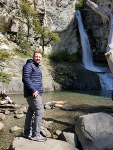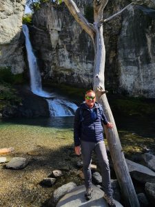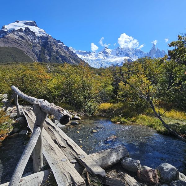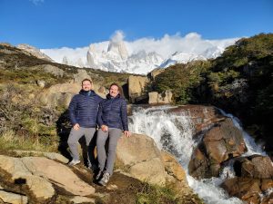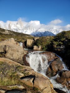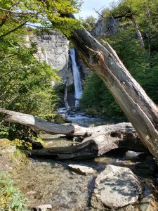 Nach 1,5 Stunden bogen wir an der Gabelung nach links zur Laguna Capri ab. An der Lagune hat man einen super Ausblick auf die Berge. Hier an der Lagune gibt es auch einen Zeltplatz. Nach dem Waldstück erreichten wir eine Hochebene und da wir hörten einen Wasserfall rauschen. Etwas abseits vom ausgeschilderten Weg fanden wir den Wasserfall und waren total begeistert. Von hier aus hatten wir einen faszinierenden Blick zum Fitz Roy.