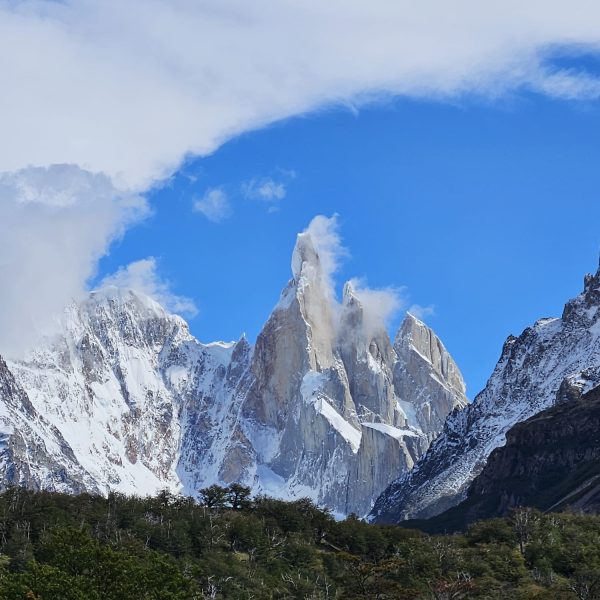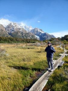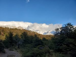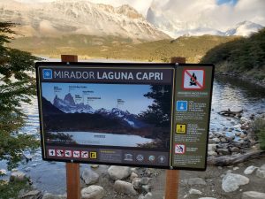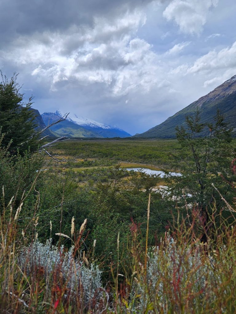 Nachdem es gestern geschüttet hat, wie aus Kübeln, war es heute recht gut Wetter. Da wir auch hier den Eintritt von € 45 sparen wollten, brachen wir schon um 6.30 Uhr auf. Am Eingang trafen wir auf viele Frühaufsteher oder auch Sparfüchse, die mit ihren Stirnlampen wie lauter kleine Glühwürmchen aussahen. Als erstes kam ein kleiner Anstieg durch den Wald, der bei Nässe sehr rutschig werden kann. Anschließend windet sich der Pfad vorbei an Feuerlöscher (blühen im Frühling) und d stacheligen Neneo Büschen. Hier erhaschten wir auch schon den ersten Blick auf den Fitz Roy. Das Wetter wurde zunehmend besser.