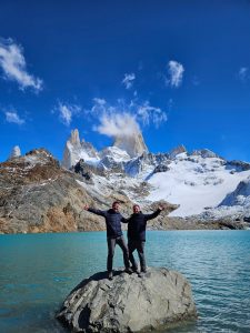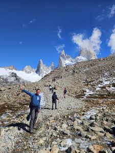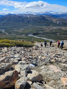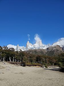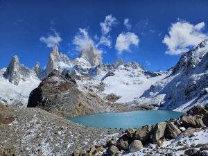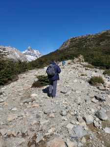 Weiter geht es, vorbei an kleinen Seen und durch eine Sumpfebene bis zum Zeltplatz Campamento Poincenot. Nach der Rio Blanco Brücke sind die letzten Höhenmeter zu überwinden. Der letzte Kilometer geht ca. 400 m hinauf, durch Schotter und Geröll. Währenddessen ist der Fitz Roy nicht zu sehen. Oben dann endlich angekommen steht man plötzlich über dem Gletschersee und dahinter ragen die Felstürme in den Himmel. Im Hintergrund liegt das patagonische Inlandeis. Wir waren uns einig, die Strapazen haben sich gelohnt. Völlig erschöpft kamen wir in unserer Unterkunft an.